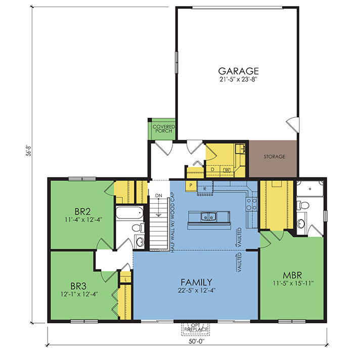 A part of our dream series, the tamarack floor plan features 3 bedrooms and 1.5 bathrooms with a foot print of 44x30 feet and 1342 total square feet of living space.